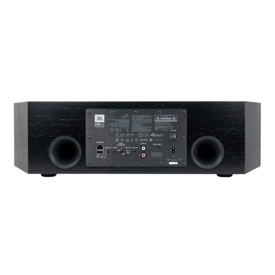 Аудиоподключения включают в себя два набора аналоговых стереовходов (одна пара RCA и один вход 3,5 мм), а также разъем HDMI Arc для подключения к телевизору с аналогичным подключением для передачи аудиосигнала и управления. Кроме того, JBL L42ms может воспроизводить потоковый контент по проводному или беспроводному сетевому соединению через Spotify Connect, Apple Airplay2 и Google Chromecast или подключаться непосредственно к устройству напрямую через Bluetooth. Все аудиосигналы передаются через усовершенствованный процессор DSP, где контент тщательно обрабатывается и выводится на динамики через 4-х канальный усилитель, обеспечивающий среднеквадратичную мощность 75 Вт на каждый низкочастотный динамик и 25 Вт на каждый твитер. Среднеквадратичной мощностью усилителя всей системы мощностью 200 Вт можно управлять с помощью сенсорной панели, расположенной на верхней панели корпуса, прилагаемого пульта дистанционного управления Bluetooth или одного из многочисленных музыкальных приложений или приложений для автоматизации.