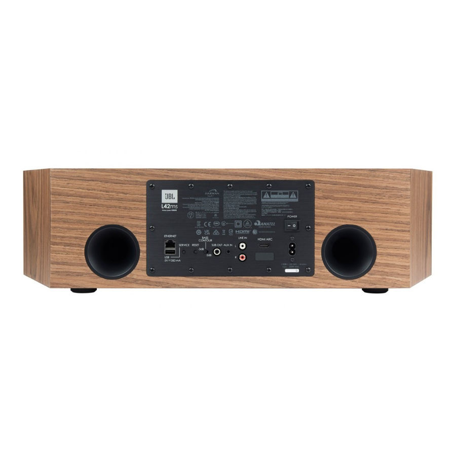 Аудиоподключения включают в себя два набора аналоговых стереовходов (одна пара RCA и один вход 3,5 мм), а также разъем HDMI Arc для подключения к телевизору с аналогичным подключением для передачи аудиосигнала и управления. Кроме того, JBL L42ms может воспроизводить потоковый контент по проводному или беспроводному сетевому соединению через Spotify Connect, Apple Airplay2 и Google Chromecast или подключаться непосредственно к устройству напрямую через Bluetooth. Все аудиосигналы передаются через усовершенствованный процессор DSP, где контент тщательно обрабатывается и выводится на динамики через 4-х канальный усилитель, обеспечивающий среднеквадратичную мощность 75 Вт на каждый низкочастотный динамик и 25 Вт на каждый твитер. Среднеквадратичной мощностью усилителя всей системы мощностью 200 Вт можно управлять с помощью сенсорной панели, расположенной на верхней панели корпуса, прилагаемого пульта дистанционного управления Bluetooth или одного из многочисленных музыкальных приложений или приложений для автоматизации.