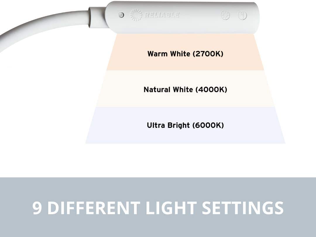 Nine light settings for detailed tasks. Choose between 3 colour and 3 brightness settings - Natural white (4000K), Warm White (2700K) and Ultra Bright (6000K)