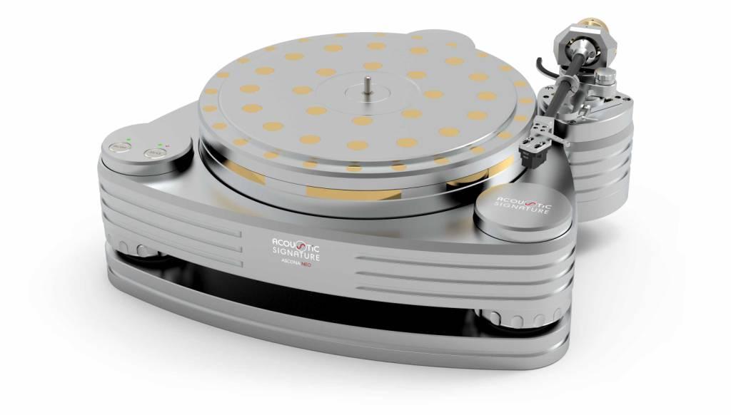 Крупногабаритная, массивная 335-миллиметровая сэндвич-пластина из анодированного алюминия с дополнительным латунным слоем для проигрывателя Ascona NEO.