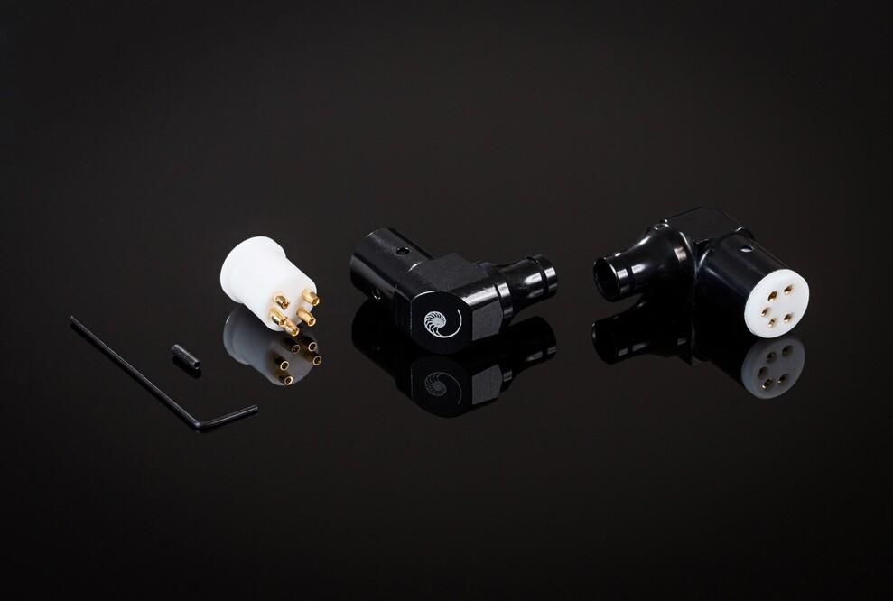 Прямоугольный разъем премиум-класса DIN phono (5-контактный разъем). Латунные контакты непосредственно позолочены в корпусах из перфторэтилена и пропилена. Алюминиевый корпус, черный анодированный. Вставку DIN можно использовать в двух различных положениях с помощью второго отверстия для прилагаемого винта для личинки.