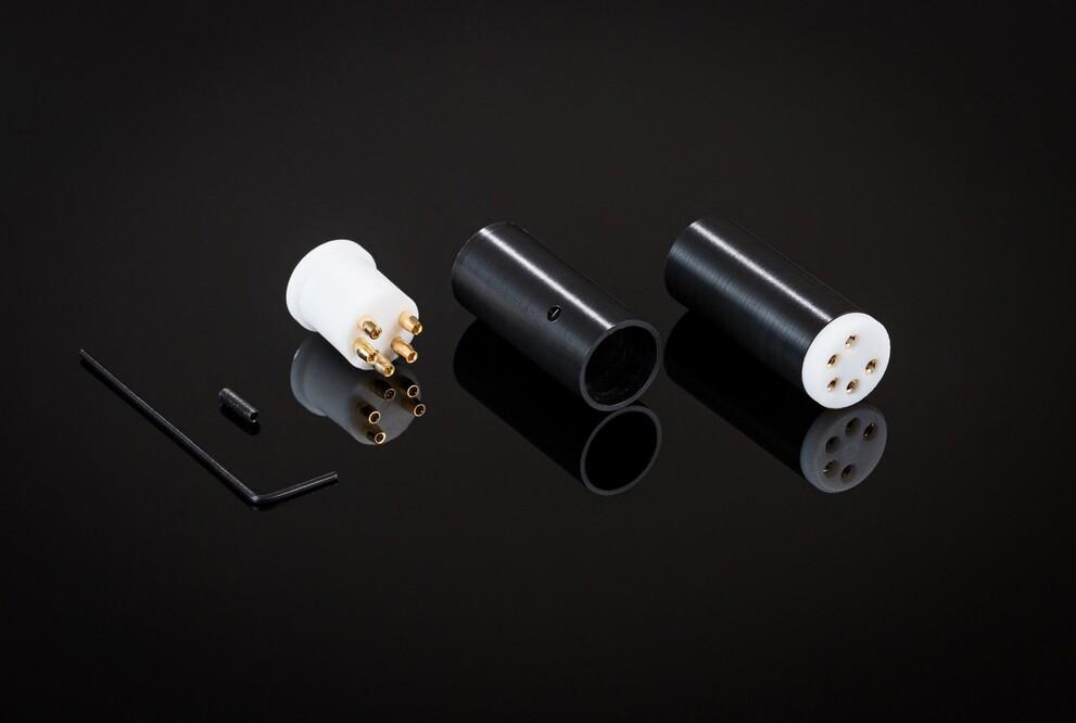 Разъем DIN-Phono с втулкой Delrin (5-контактный разъем). Латунные контакты непосредственно позолочены в корпусах из перфторэтилена и пропилена. Простая версия SDIN без защитной алюминиевой втулки. 5-контактный разъем DIN "мама" с фиксирующей втулкой из черного делрина.