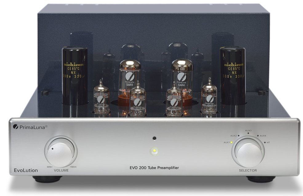 PrimaLuna EVO 200 Pre – это третий по старшинству из предусилителей новой серии. У предусилителей серии EVO даже выпрямитель в блоке питания реализован на лампах. Такой вариант имеет более низкий уровень собственных шумов, чем выпрямители переменного напряжения на полупроводниковых диодах. За счет этого получается более естественное, текстурно богатое и волнующее воспроизведение, поскольку в схеме используются только лампы (pure tube). Чисто ламповый вариант стоит гораздо дороже и обычно встречается лишь в моделях стоимостью от $10,000 и выше. Тем не менее, PrimaLuna использует целых два кенотрона 5AR4 в схеме типа «двойное моно» - чтобы представить музыку во всей ее трехмерности и гарантировать мурашки при прослушивании. Конструкция типа «двойное моно» (dual-mono) стоит гораздо дороже, чем обычная, поскольку для нее нужно иметь два силовых трансформатора, две схемы стабилизатора, и по существу, удвоенное число остальных схемных элементов. В одном корпусе получается два раздельных предусилителя, и такое можно редко встретить даже в самых дорогих моделях. Однако предусилители PrimaLuna сконструированы именно так – для достижения максимальной достоверности стерео образа и подлинного ощущения пространства. Переключатели селектора входов обычно пропускают шум и сигналы из других источников, так как они никогда не отключают соседние входы полностью. При этом они ухудшают свои характеристики с возрастом, требуя применения чистящих средств для контактов. Многие из них смонтированы на передней панели и связаны с входными разъемами на задней панели длинными проводами. Эти провода собирают на себя, как антенны, случайные радиочастотные шумы и электромагнитные помехи (EMI). В усилителях PrimaLuna все гораздо лучше. Вместо механического переключателя, для выбора входного сигнала используются загерметизированные реле премиум-качества установленные сзади – именно там, где приходят сигналы от ваших компонентов. Когда входной сигнал выбран, то реле замыкается, обеспечивая вам самое лучшее возможное соединение. Все остальные реле остаются открытыми, поэтому шум и сигналы из других источников не могут просочиться. Путь сигнала теперь максимально короткий, и поэтому нет проводов для сбора помех и шумов. От предусилителя обычно не требуется дополнительное усиление аудио сигнала в системе. Основное требование аудиофилов – низкий уровень шума. Почему же многие производители проектируют предусилители с усилением от 20 до 27 дБ? При этом все удивляются, откуда в звуке возникает "шипение", или почему лампы проявляют «микрофонный эффект»? Поэтому в предусилителях PrimaLuna используется подход, называемый SmartGain. Он ограничивает усиление на уровне всего лищь 10 дБ, и вы обнаружите, что ваш предусилитель PrimaLuna работает так же тихо, как «церковная мышь». Если лампы менее совершенны, вы никогда не узнаете об этом, потому что они не усиливают сигнал до слишком громкого. Еще одна эксклюзивная функция предусилителей PrimaLuna – это PerfectMatch, схема, сконструированная так, чтобы представлять идеальное значение импеданса в 100 кОм для всех компонентов-источников. Это особенно важно для ламповых источников, таких как фонокорректоры и ЦАП – для наилучшего звучания. В схеме предусилителя используются только отборные компоненты высокого качества, такие как заказные тороидальные силовые трансфо