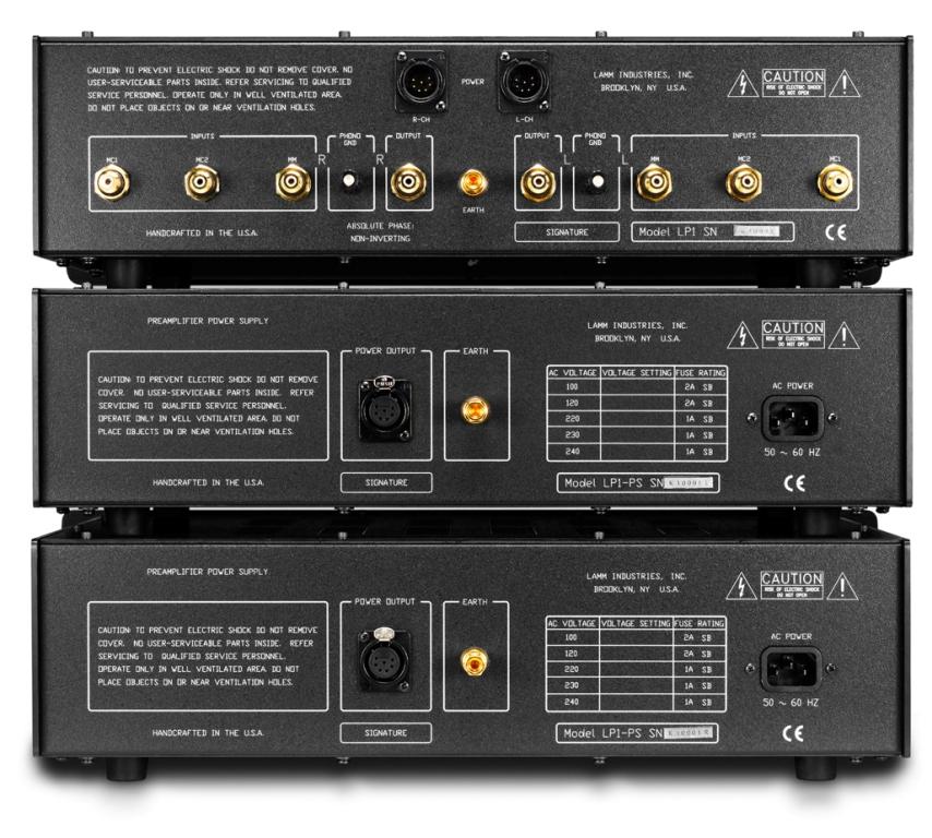 Трёхблочный фонокорректор-предусилитель Lamm LP1. Двойной монофонический ламповый предусилитель с двумя отдельными нейтральными источниками питания, оснащенными полноволновыми вакуумными выпрямителями, дроссельными фильтрами, высоковольтными регуляторами вакуумной лампы, твердотельными аналоговыми непереключаемыми регуляторами низкого напряжения, используемыми в качестве источников питания нагревателя. Три отдельных входа для картриджей MM и MC (два входа). Во всех каскадах усиления используются сильноточные вакуумные триоды с высокой транспроводимостью и сверхнизким уровнем шума. Чистая операция класса А. Обратная связь по контуру не используется. Точная пассивная сеть эквалайзера RIAA. Комплект ламп: две-6C3P (6C3П), две-6C45P (6c45П) и (фонокорректор); четыре-12AX3/12 BE3, два-6C19P (6C19П), два-6AK5, два-5651A (источника питания).