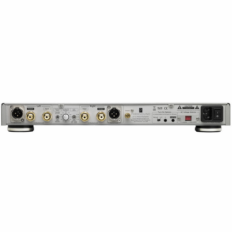 Фонокорректор Parasound JC3 JR изготовлен в полноразмерном корпусе, дизайн передней панели которого совпадает с другими компонентами серии. Очень небольшая высота модели позволит установить ее в стойку с другой Hi-Fi-техникой, даже если в ней остается не слишком много места. Спереди находятся всего две кнопки управления – включения и перевода корректора в монорежим. Наличие последней наверняка оценят владельцы винтажных виниловых коллекций. Значительное свободное место внутри корпуса Parasound JC3 JR обеспечило возможность оптимального размещения компонентов его схемы. Плата входной секции, на которой смонтированы разъемы и сам предусилитель-корректор, находится на максимальном расстоянии от питающего тороидального трансформатора в противоположном углу. Платы сетевой коммутации и стабилизированного блока питания также удалены от чувствительных аудиосхем. Входная секция дополнительно защищена металлическим экраном. Силовой трансформатор в модели также экранированный. Фонокорректор имеет симметричную компоновку каналов на печатной плате для выравнивания стереокартины. Входные цепи устройства работают в классе А, что дает наиболее точную передачу сигнала. Цепи RIAA-коррекции построены на прецизионных компонентах для получения характеристики, полностью соответствующей требованиям стандарта. Parasound JC3 JR может работать со звукоснимателями с подвижным магнитом (тип MM) или катушкой (тип MC). Схему аппарата разрабатывал легендарный главный инженер компании Джон Керль. Для согласования фонокорректора с различными картриджами предусмотрены плавная регулировка входного импеданса в диапазоне от 50 до 550 Ом (для MC-моделей) и три настройки коэффициента усиления. Parasound JC3 JR оснащен высококлассными RCA-разъемами компании Vampire и XLR-гнездами Neutrik. Также предусмотрен вход управляющего 12-вольтового триггера для включения фонокорректора подачей внешнего сигнала. В схеме модели используются резисторы компании Vishay-Dale и другие отборные компоненты, а коммутация сигналов выполнена на реле.