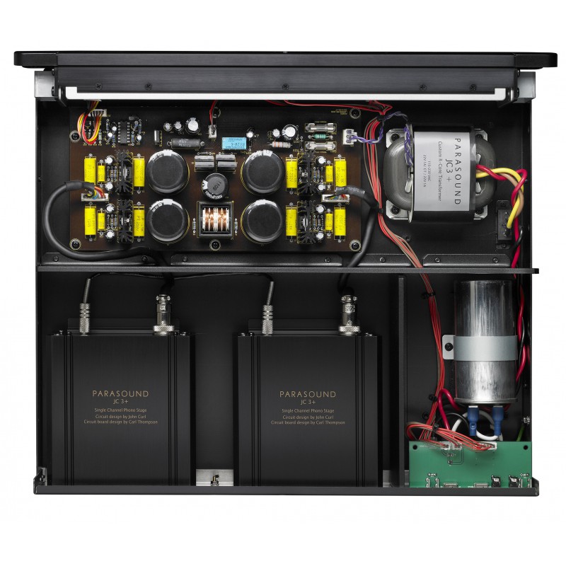 Фонокорректор Parasound JC3 Plus был разработан легендарным инженером Джоном Керлем на базе его же модели JC3 с целью дальнейшего совершенствования ее параметров. При разработке были приложены значительные усилия для еще большего снижения фонового шума, что потребовало разработки новой входной схемы. Она изготовлена на плате с позолоченными медными дорожками и в ней применены прецизионные компоненты. Плата была разработана при участи Керля и ведущего инженера компании Джонсона. Алюминиевый корпус аппарата надежно защищает его схемы от помех. Фонокорректор рассчитан на работу c MM- и MC-картриджами. Если для моделей с подвижным магнитом входное сопротивление является стандартным и составляет 47 кОм, то для картриджей с подвижной катушкой оно может меняться. Для точной настройки величины входного импеданса в фонокорректоре Parasound JC3 Plus установлены переменные резисторы фирмы Vishay. Они изготавливаются по заказу Parasound и отличаются очень низким уровнем шумов. При желании можно установить фиксированное входное значение импеданса и для MC-картриджей. Конструктивно аппарат выполнен в виде двух полностью независимых фоно-модулей (по одному для каждого канала), что обеспечило получение впечатляющей стереокартины. Модули имеют трехслойное экранирование для полной защиты от помех. Предусмотрены небалансные входы, а также небалансные и балансные выходы. Все разъемы изготовлены компанией Vampire и имеют 24-каратное золотое покрытие. Блок питания Parasound JC3 Plus построен на базе тороидального трансформатора и имеет надежную стабилизацию выходного напряжения с полным устранением шумов. Фильтрующие конденсаторы большой емкости специально разработаны для использования в аудиоцепях и обеспечивают широкий динамический диапазон звука.