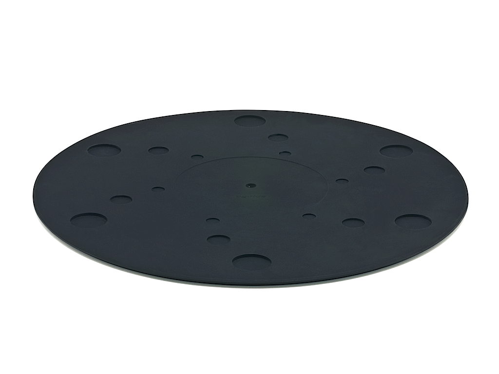 Мат изготовлен на основе положительного опыта при изготовлении демпфера - маховика Ojaide MJ-12 и положительного опыта применения ультратонкого бутилкаучука BR-ONE. Расчеты показали, что большой и прочный маховик MJ-12 приносит стабильность в воспроизведение, однако для достижения наилучшего результата необходимо создать некий демпфирующий слой. Были проведены испытания с различными материалами и толщиной, и в начале мы разработали модель BR-ONE толщиной в 1 мм. Однако не остановившись на достигнутом, наши инженеры позднее представили модель BR-12, которая имеет коническую форму утончающуюся к центру, и круглые отверстия различного диаметра. По нашим данным эти меры крайне положительно сказываются на стабильности и демпфирующих свойствах.