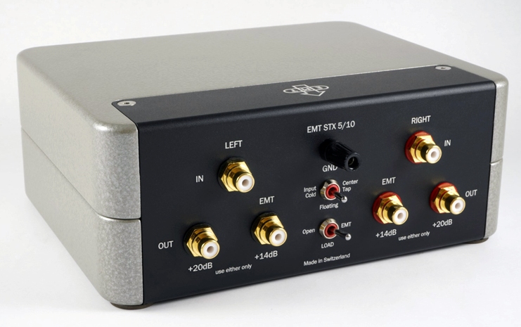 Повышающий трансформатор для MC-звукоснимателей. Идеально согласуется с головками EMT. Оснащен двумя выходами для головок с разным уровнем выхода. Выполнен на тороидальном сердечнике особого состава, обеспечивающем минимальные потери и шумы и максимально высокое разрешение сигнала. В обмотках использован провод из чистого серебра 99,99%. Дает возможность выбора одного из трех варианта заземления: плавающее, с центральным выводом и с «холодным» контактом. Усиление: +14 дБ (1:5) или +20 дБ (1 : 10).