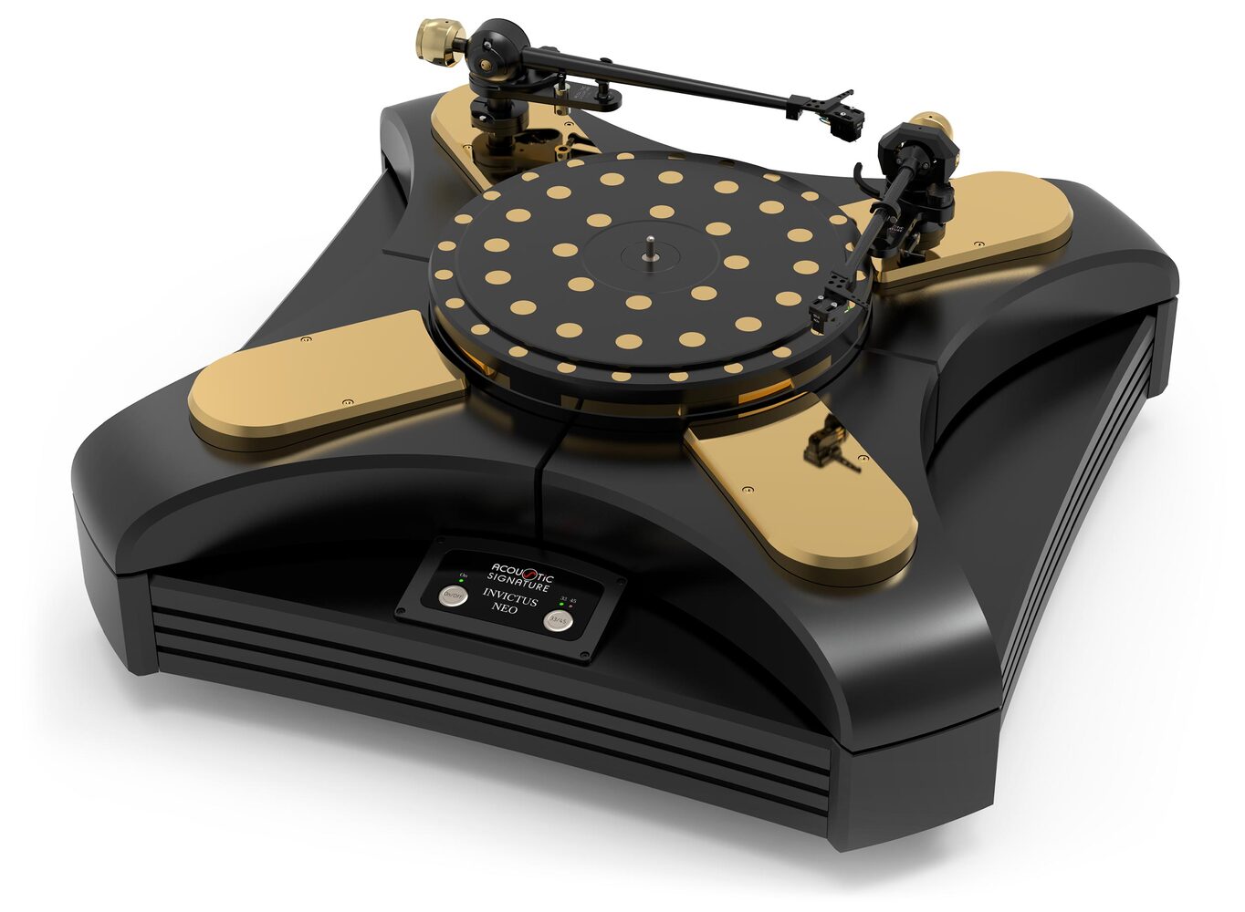 Теперь мы могли бы написать эссе о нашем Invictus NEO. Но в этом не было бы никакого смысла. Вы все равно нам не поверите, пока сами не услышите наш шедевр. Итак, давайте сделаем это коротко: куда бы вы ни посмотрели – акустическая подпись Invictus NEO - лучший проигрыватель в мире. Пятно. Проигрыватель винила Invictus Neo — это воплощение апгрейда поколения Neo. Шедевральный сверхмассивный Invictus предыдущего поколения приобрел новые достоинства благодаря «вечному и неубиваемому» подшипнику DTD, алмазной полировке оси диска, интегрированным в корпус 6 двигателям с системой синхронизации и подавления вибраций AVC третьего уровня. Интегрированные двигатели даже позволили сделать новый Invictus более компактным. Invictus в версии Neo остается верным девизу (invictus по латыни — непобедимый) и, как считают его создатели, с большим запасом выигрывает титул лучшего проигрывателя винила в мире. 6 двигателей в изолированных от вибраций отсеках. Опорный диск Invictus устанавливается на алюминиевый малый диск, на который собственно и передается вращение двумя ремнями (пассиками) привода. Каждый из ремней приводится в движение тремя двигателями, расположенными под углом 120° друг к другу, что делает движение пассика плавным, без рывков и убирает нагрузку на подшипник от привода. Два набора двигателей увеличивают этот эффект и, плюс к тому, дают достаточный крутящий момент, чтобы привести в движение 19-килограммовый опорный диск. Электронная система запуска при старте помогает двигателям раскрутить диск до номинальных оборотов за 10 секунд, а затем снижает мощность двигателей примерно на 70%, так полная мощность уже не нужна для стабильного вращения. Соответственно при воспроизведении двигатели работают в оптимальном режиме и не вибрируют. Трехточечная стабильная система опор использует новой конструкции ножки на магнитной подушке. Еще в 2000 году Acoustic Signature изобрела и внедрила новую систему гашения вибраций главного (на который кладется пластинка) диска проигрывателя. Система вставок действует просто и чрезвычайно эффективно. Известно, что паразитные вибрации приходят в диск разными путями и источники возникновения у них тоже разные. Даже сама игла звукоснимателя при движении по канавке вибрирует и ее «песня» прекрасно слышна, если приблизить ухо к вращающемуся винилу. Естественно, что вибрации иглы уходят не только в воздух, но и обратно в пластинку и дальше в опорный диск. Гуляющие взад вперед отражения полезного сигнала снова улавливаются иглой и вызывают характерную «фазовую мутность», незначительную, но грязную окраску звука. Если в комнате звучит музыка или просто происходят какие-то звуки, то второй путь проникновения вибраций в проигрыватель — воздушный. Воздушные волны возбуждают колебания в опорном диске, в самой пластинке и в шасси проигрывателя. Игла звукоснимателя по своей природе является датчиком вибраций и подмешивает в полезный электрический сигнал еще и эти паразитные колебания. Они замазывают микродетали, нюансы музицирования и нюансы акустической атмосферы записи. Расположенные в определенных секторах цилиндрические вставки эффективно разбивают путь паразитных вибраций, поглощая и рассеивая их энергию, которая теперь не доходит до звукоснимателя. Эффективность виброгасителей более 80 дБ! В опорном диске Invictus первая группа успокоителей кол