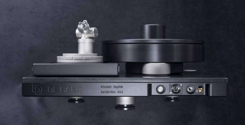 De Baer Sapphire имеет внешний источник питания; это делает его дизайн сдержанным и минималистичным. Подшипник опорного диска и основание для тонарма соединены с шасси закаленными стальными шариками. Это обеспечивает максимальную жесткость, при минимально возможной площади контакта. Компоненты хорошо отделены друг от друга. То, что обычно монтируется на одной основе, распределено на 5-ти уровнях в проигрывателе De Baer. Подшипник опорного диска представляет собой изготовленный с максимальной точностью - подшипник скольжения. Диск вращается в осевом направлении на двух магнитах. Два жестких хромированных протектора берут на себя радиальную нагрузку. Втулки подшипников изготовлены из пористого спеченного материала с зазором менее 0,01 мм. Корпус подшипника, заполненный маслом, не требует технического обслуживания в течение всего срока службы. Сложная конструкция внешне невзрачна, количество встроенных компонентов скрыто. Диск состоит из 138 изготовленных деталей и множества стандартных элементов. Наиболее важной конструктивной особенностью проигрывателя De Baer Sapphire является строгая развязка функциональных блоков. Между диском и тонармом нет минимальных взаимодействий. Основным принципом развязки является концентрация возникающих сил на минимальной площади контакта. Это достигается за счет расположения стальных шариков, типичная поверхность контакта которых всегда представляет собой только одну точку. Как основание опорного диска а также основание тонарма, смонтированы на алюминиевой основе и в этой уникальной системе развязки алюминиевая рама касается только опорных поверхностей шаров. Сами рамы, в свою очередь, крепятся к основному шасси Sapphire по тому же принципу. Подшипник опорного диска - чрезвычайно сложная конструкция. Ось сначала обрабатывается твердым хромированием, а затем подвергается сверхточному процессу шлифования, который обычно применяется только для деталей турбин работающими с высокими оборотами. Во всем мире очень мало компаний, которые владеют необходимой точностью этого производственного процесса. Эта сверхточная ось находится в гидростатических подшипниках с минимальными потерями на трение. Система герметично закрыта, чтобы избежать утечки жидкости во время транспортировки. Опорный диск состоит из двух частей. Нижняя часть диска образует единое целое с подшипником. Верхняя пластина, в свою очередь, соединена с нижней пластиной с помощью уникальной системы развязки на основе стальных шариков. Таким образом, верхняя часть почти полностью отделена от подшипника опорного диска. Микровибрации привода, которые могли бы передаваться на пластинку, практически полностью исключены. Как верхняя, так и нижняя части опорного диска изготовлены из POM, пластика с идеальными свойствами для этого применения. Огромные усилия по развязки всех функциональных систем от шасси и друг от друга абсолютно необходимы для воспроизведения современной музыки. Воспроизведение очень плотное и мощное, в то же время оно кажется расслабленным. Звуковое изображение становится глубоким и широким, почти голографическим. Sapphire оснащен высококачественным двигателем постоянного тока. Внешний источник питания также доступен в эталонном исполнении, производимом швейцарской компанией Soulution. Для контроля скорости в двигателе 