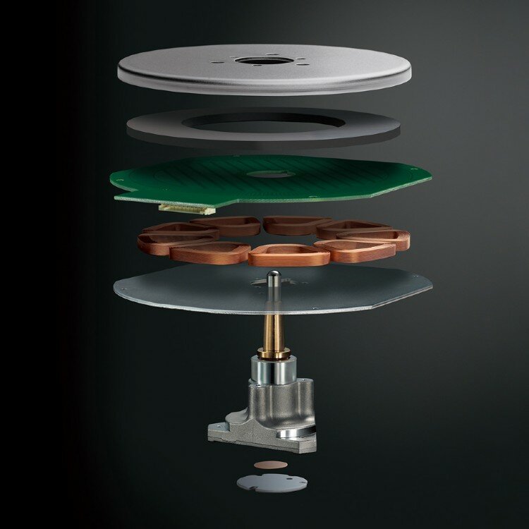 Проигрыватель оснащен массивным опорным диском из алюминия с нанесенных на верхнюю часть резиновым покрытием. Такое решение позволило надежно защитить пластинку от вибраций и сделать звучание прозрачным и детализированным. Диск вращает высокоточный двигатель, стабильность вращения которого поддерживается новейшей схемой управления. В модели Technics SL-100C применено электронное изменение скорости вращения пластинки.